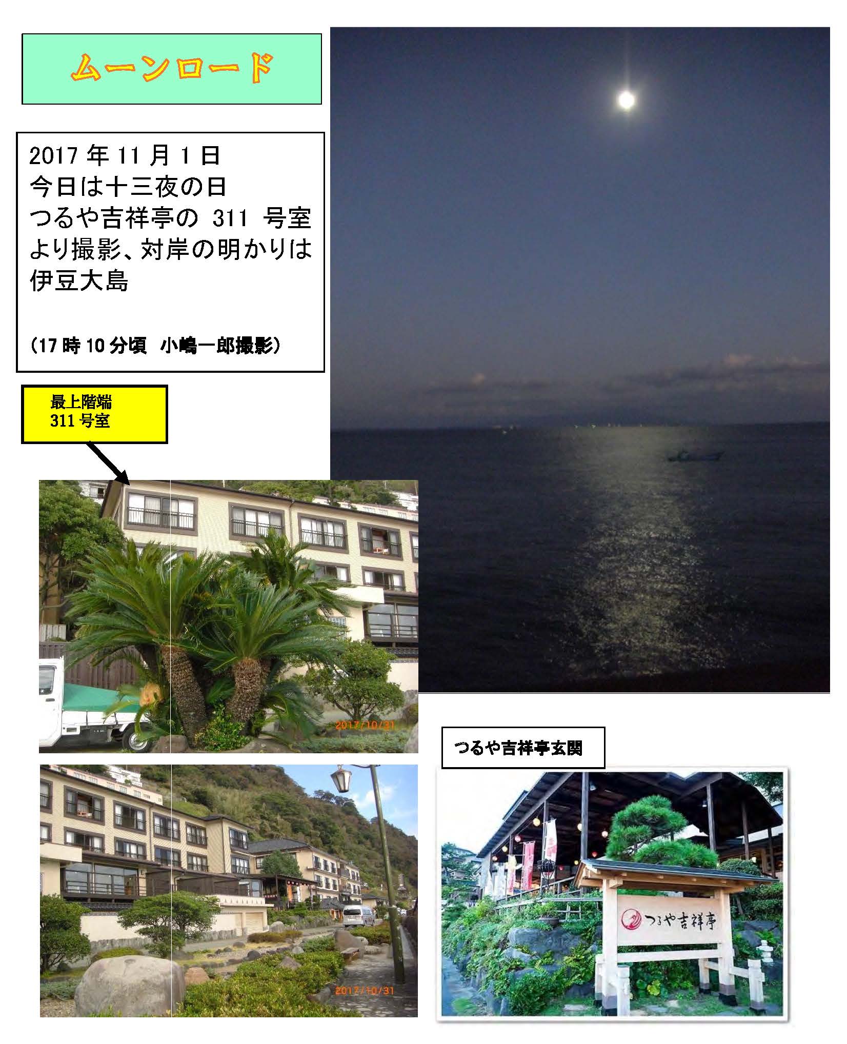 この度静養を兼ねて10月31日から11月2日と伊豆北川温泉旅行(2泊3日)をして参りました。 ところが驚き、11月1日宿泊した部屋から十三夜の月を観賞していると、ムーンロードに直面しました。 あまりにも素晴らしい光景でしたので撮影しました。