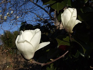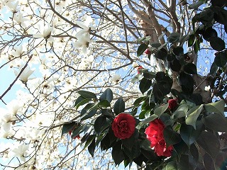 満開の白木蓮を見た。大ぶりの椿も美しかった。